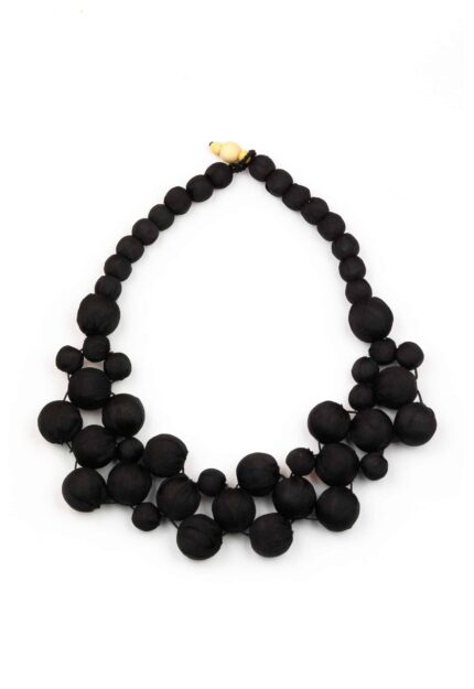 Collana in seta girocollo con all’interno 50 palline di legno della dimensione variabile da 1 cm a 3 cm.