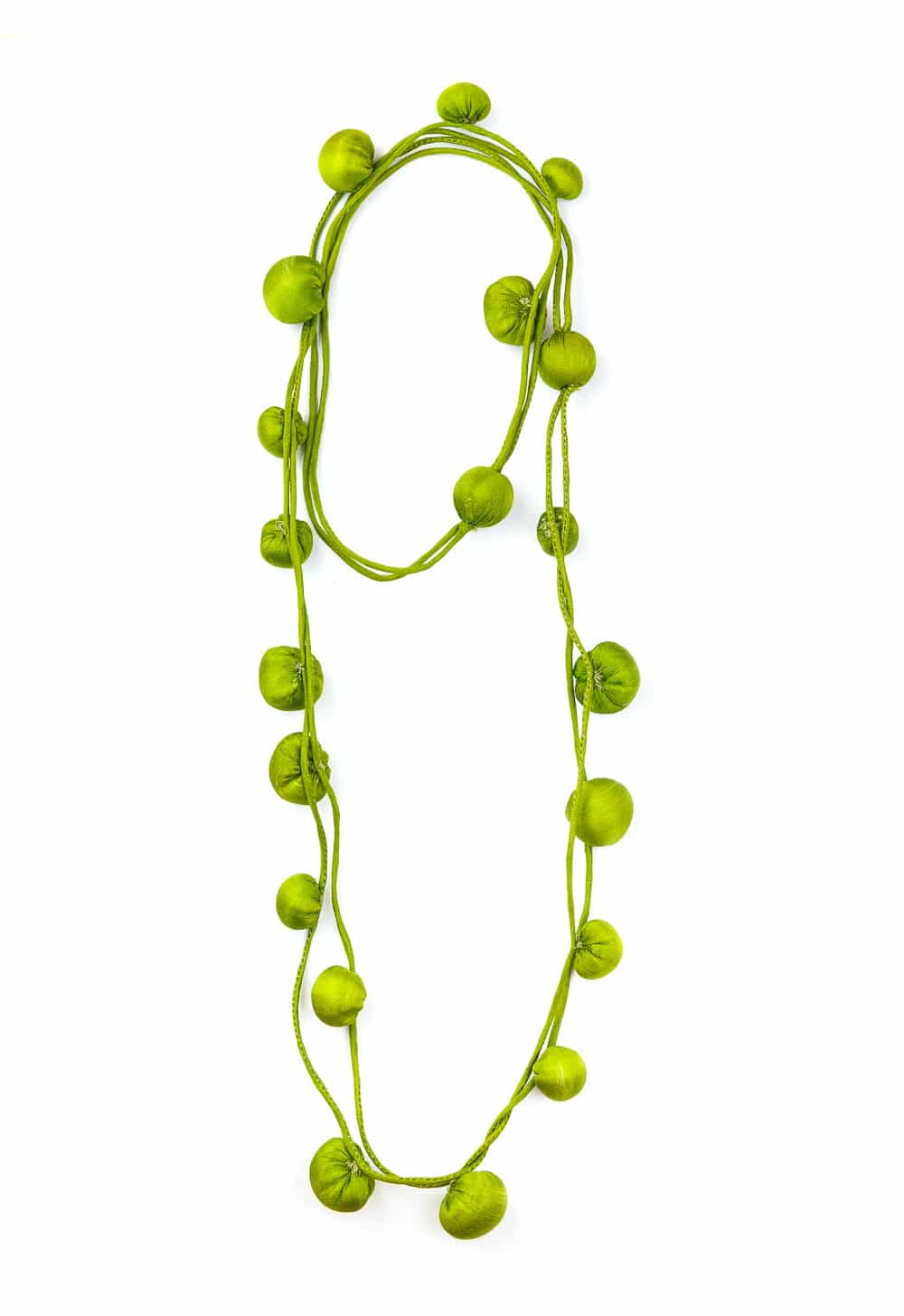 Necklace made of 100% silk, length about 170 cm, suffcient for two rounds around the neck. Sold in its silk bag.