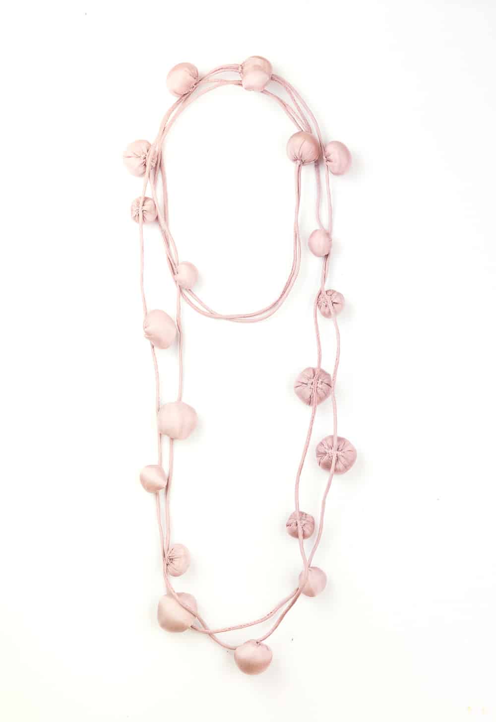 Collana realizzata in seta, di lunghezza di 170 cm circa, cucita per faredue giri intorno al collo.