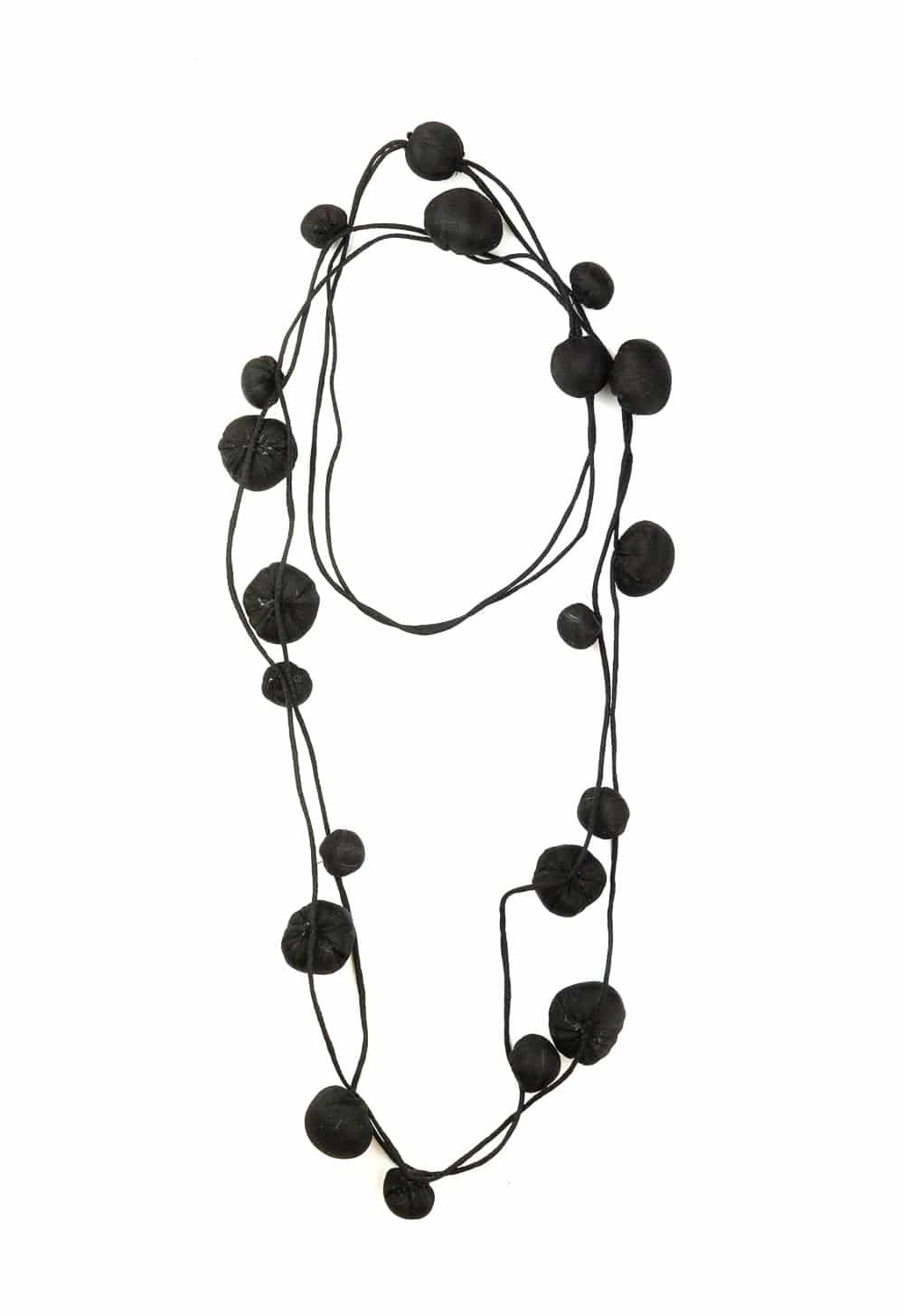Necklace made of 100% silk, length about 170 cm, suffcient for two rounds around the neck. Sold in its silk bag.