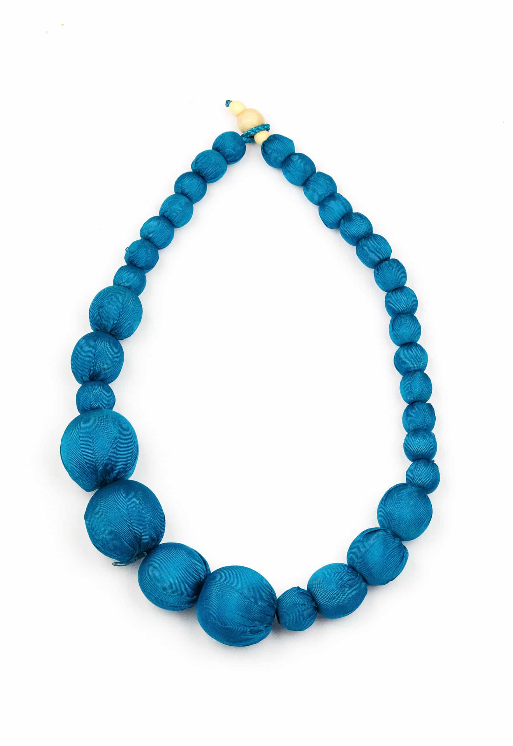 Collana in seta girocollo con all’interno 32 palline di legno della dimensione variabile da 1 cm a 3 cm.