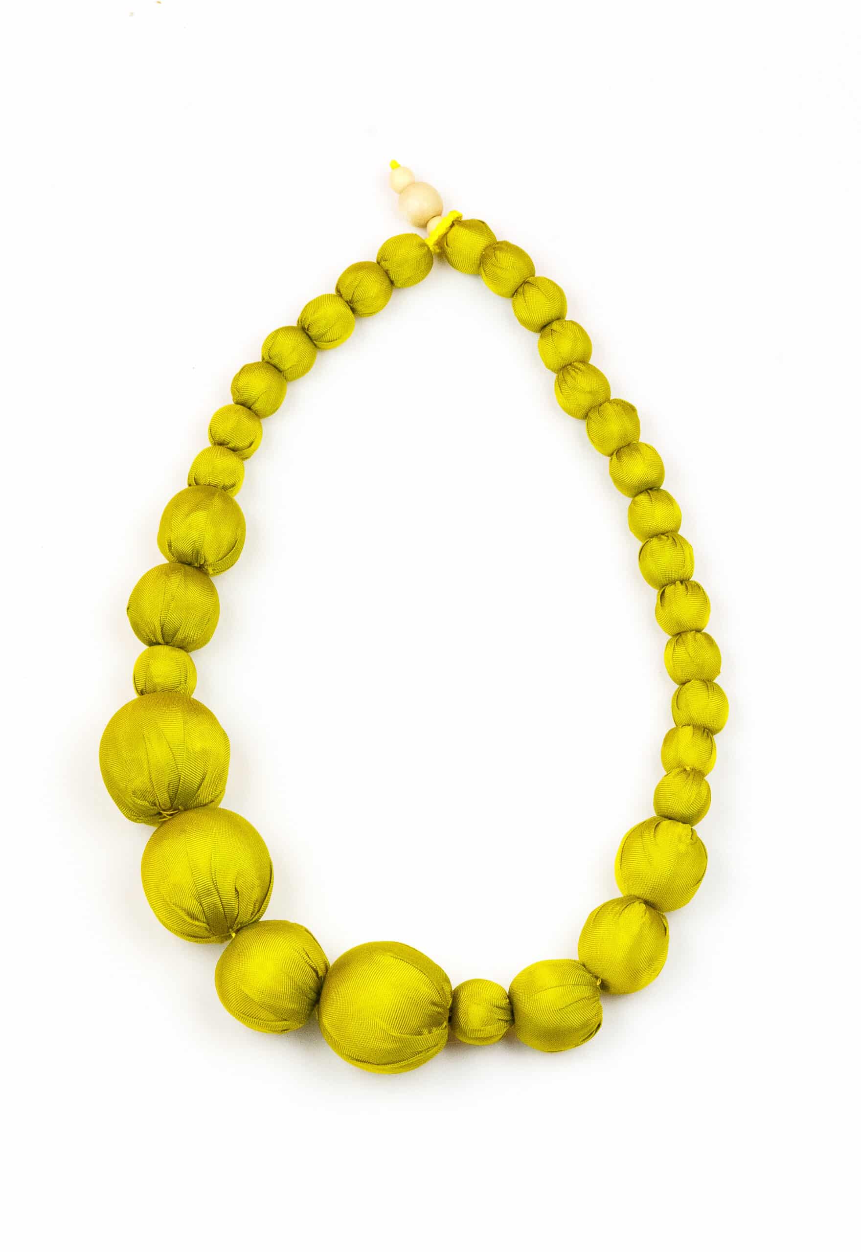Collana in seta girocollo con all’interno 32 palline di legno della dimensione variabile da 1 cm a 3 cm.