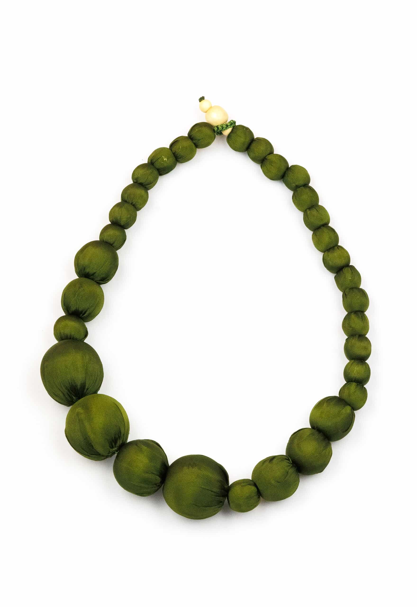 Collana in seta girocollo con all’interno 32 palline di legno della dimensione variabile da 1 cm a 3 cm.
