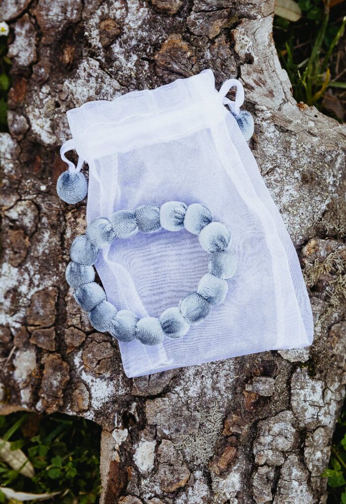 Braccialetto realizzato a mano con 16 sfere di legno ricoperte di morbido velluto.